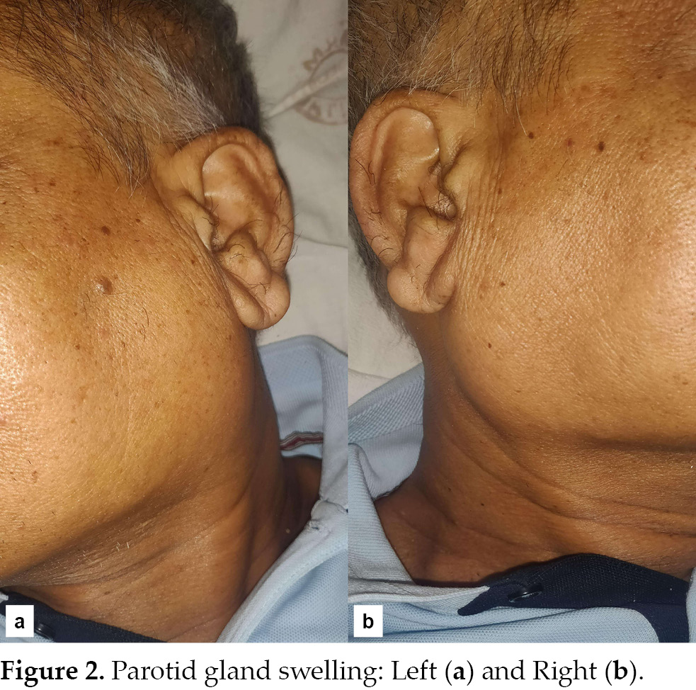 asymptomatic and on examination, he did not have parotid swelling. He was