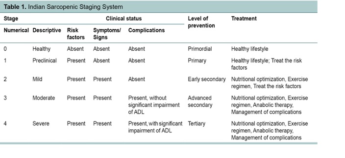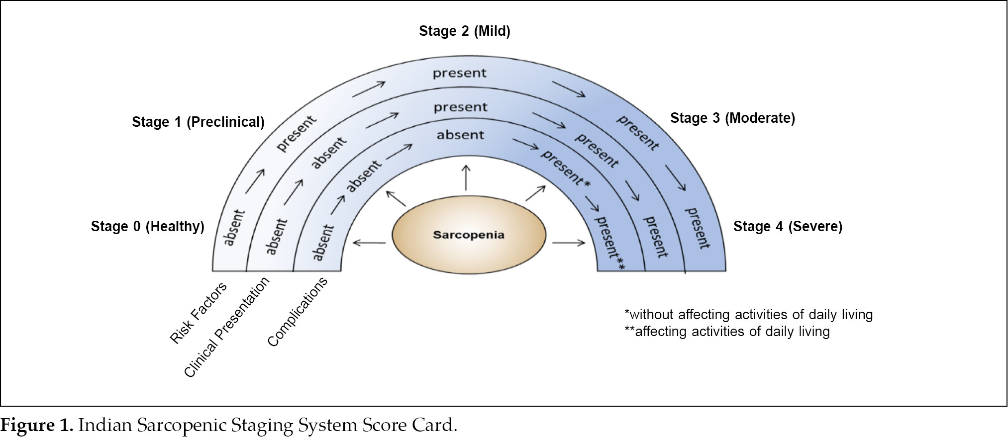 On similar lines, we propose the Indian Sarcopenia Staging System (ISSS). The ISSS lists 5 stages, which are numbered from 0 to 4, based upon their severity. A descriptive term is mentioned for each stage (Table 1). These are differentiated