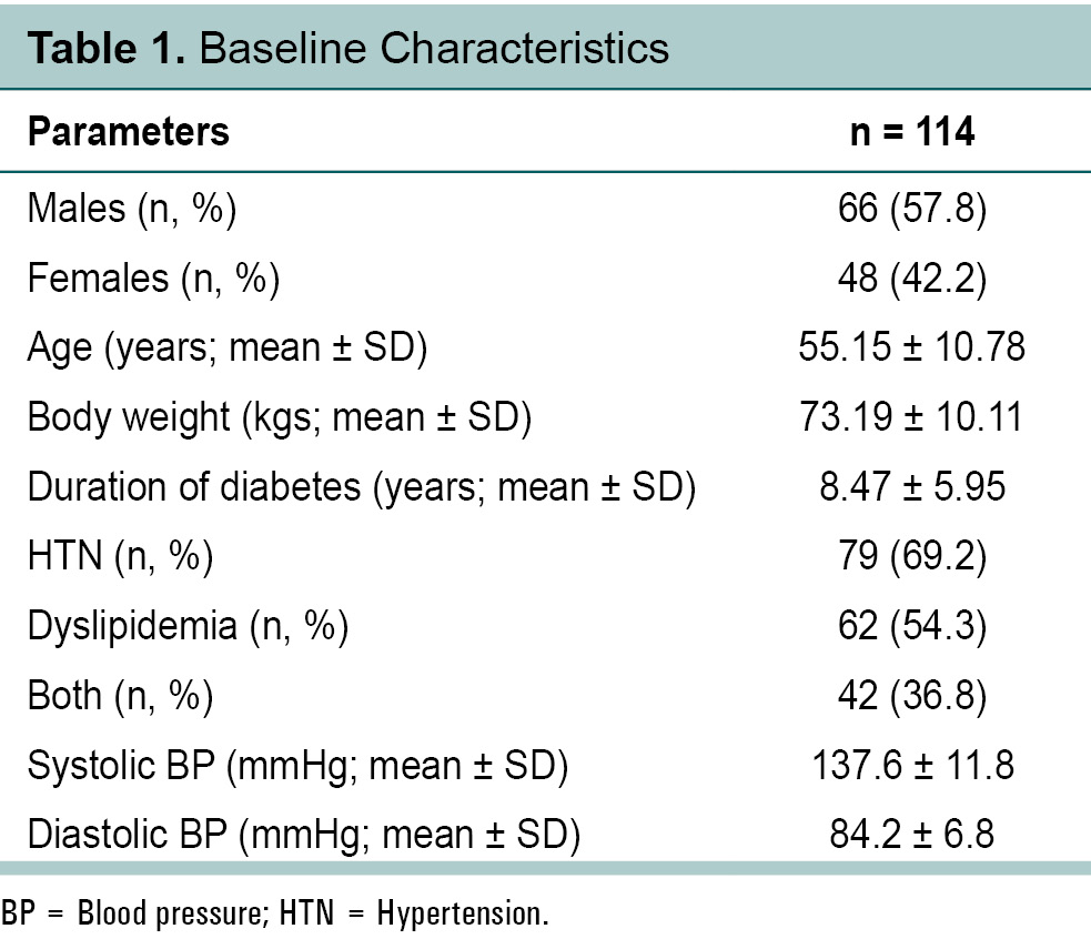 A total of 114 patients with T2DM were included in the study. The mean age of the cohort was 55.15 years, and the mean duration of diabetes was 8.5 years. The majority of patients were male (58%), mean body weight of the cohort was 73.19 kg. Significant