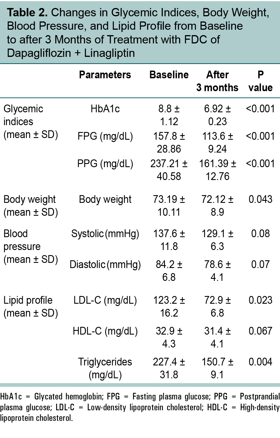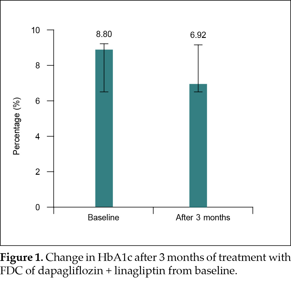 At baseline, patients had suboptimal glycemic control with a mean HbA1c of 8.8% ± 1.12% even after glimepiride and metformin therapy. After 3 months of treatment with dapagliflozin/linagliptin FDC, there was a significant reduction in HbA1c to 6.92%