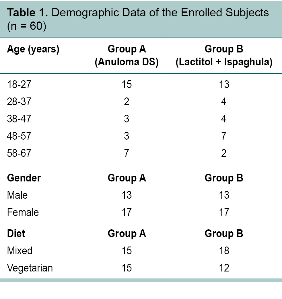The study designed as an open-label comparative double arm clinical study enrolled 62 subjects visiting medicine OPDs of our hospital for the treatment of constipation. After screening, eligible subjects were instructed to take either Anuloma DS 1 tablet