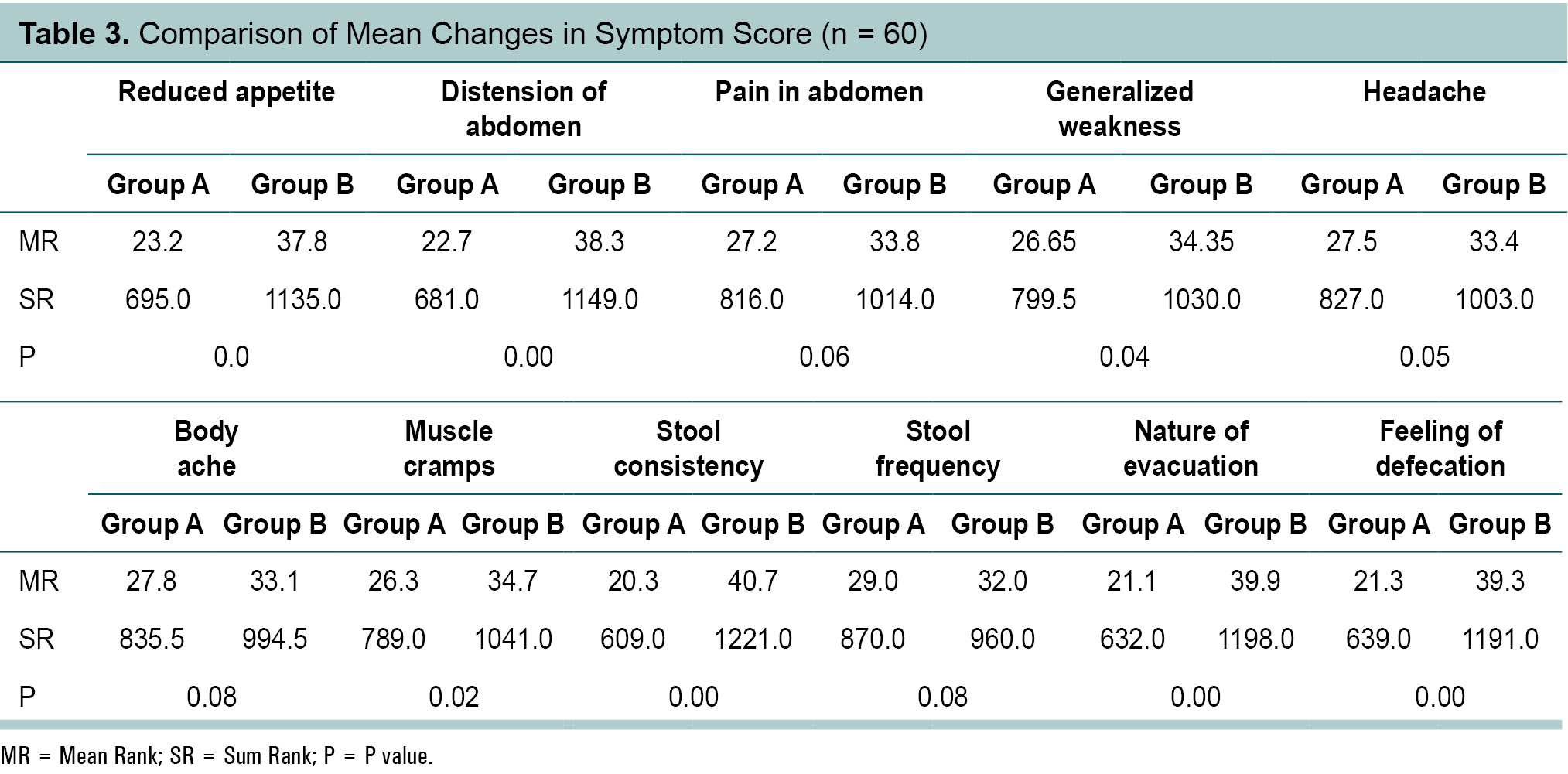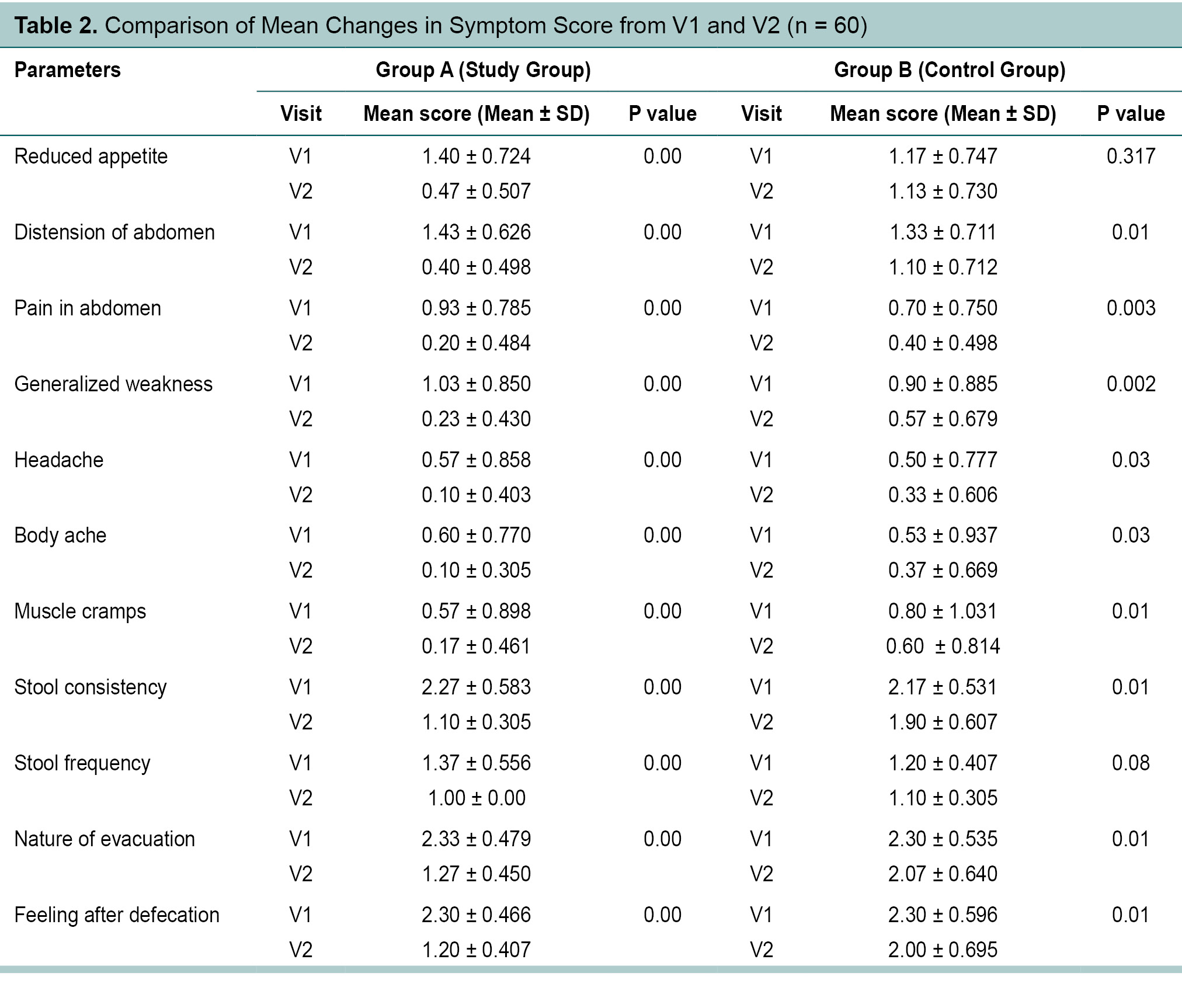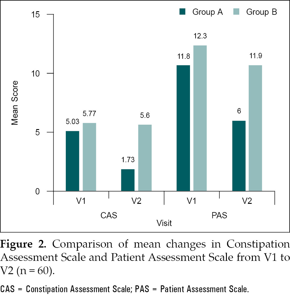 The primary study objective assessed changes in symptoms of constipation such as consistency of stool, frequency of stool, nature of evacuation, pain in abdomen, generalized weakness, headache, body ache, and muscle cramps. Secondary end points were changes