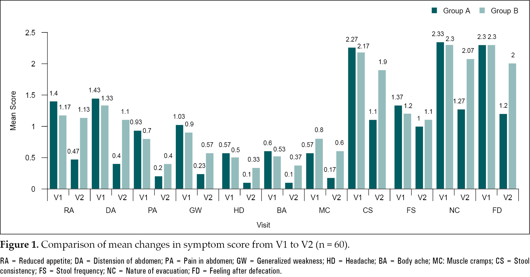 scale. The mean symptom scores were significantly improved in Group A compared to Group B as shown in Tables 2 & 3 and Figure 1.