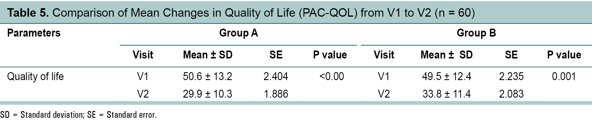 Group A had significantly greater improvement in quality of life than Group B as assessed via the Quality of Life Questionnaire (Table 5).