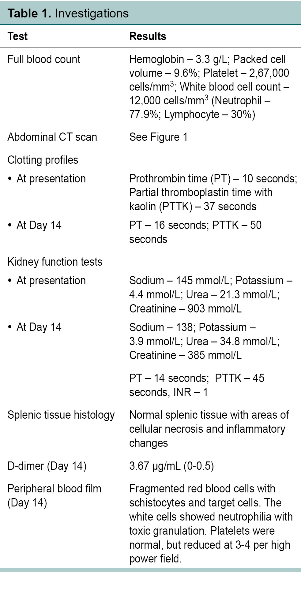 Oxygen therapy was initiated and he was advised nil per os. He underwent laparotomy, on Day 1 of admission which revealed a ruptured spleen with a subcapsular hematoma of approximately 2 liters and 2.5 liters of blood in his abdomen (hemoperitoneum) necessitating