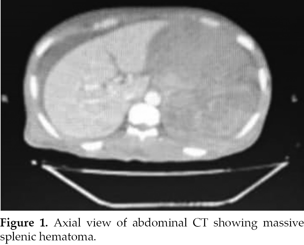 symptoms of hypovolemic shock, characterized by pallor, hypotension, and tachycardia. Additionally, he had abdominal distension and tenderness. An abdominal CT scan revealed a splenic hematoma and intra-abdominal hemorrhage. The patient required a