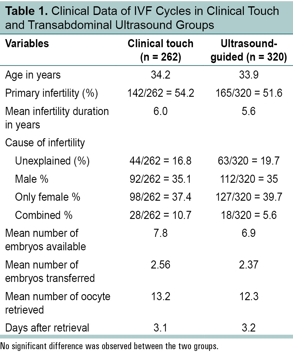 A retrospective study of in vitro fertilization and embryo transfer (IVF-ET) cycles from June 2011 to August 2012 was performed. Between June 2011 to December 2011 the clinical touch method had been adopted for 262 cycles in our IVF-ET program.