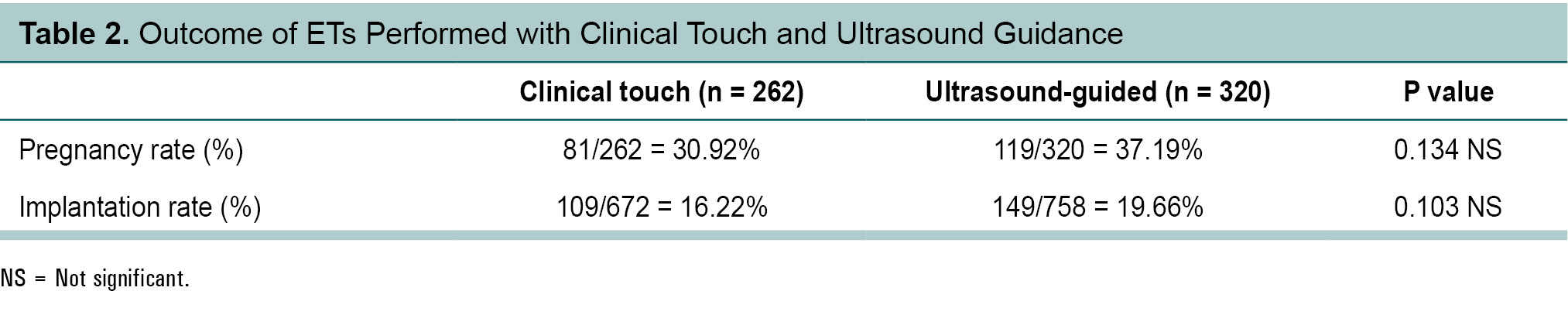 The pregnancy rate and implantation rate appeared higher in the ultrasound-guided group but not significant statistically (Tables 1 and 2).