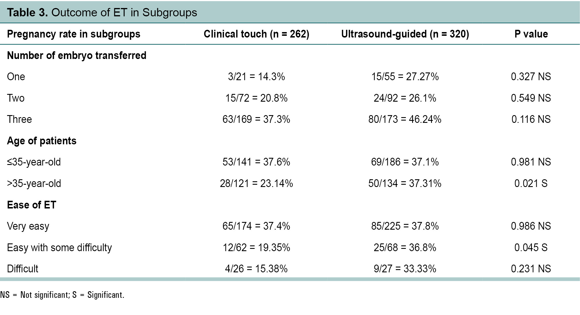 some difficulty, there appeared to be a substantial improvement in the pregnancy rate and the difference was statistically significant. We believe that ultrasound-guided ET should be used in these subgroups.