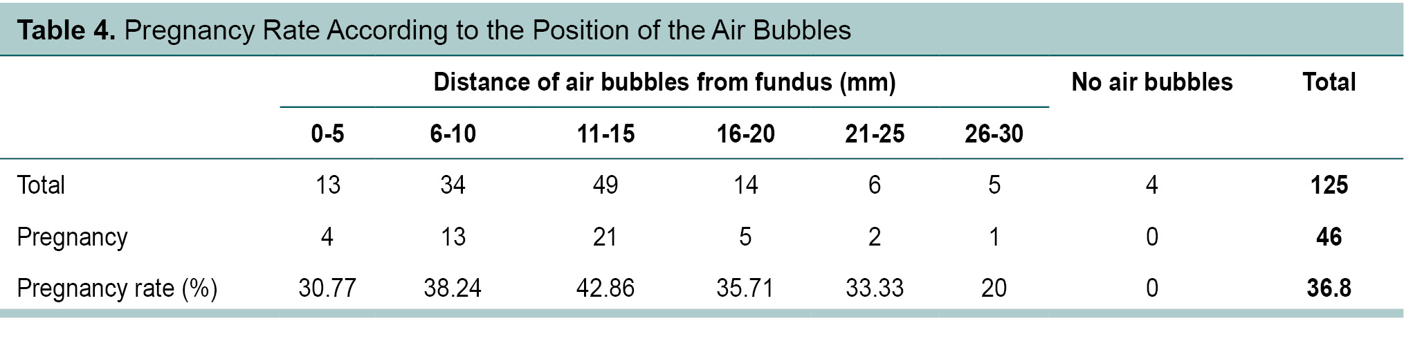 Out of 320 ultrasound-guided ET, in 125 patients, distance of air bubbles from fundus was noted. Pregnancy rate according to the position of the air bubbles was calculated. Maximum pregnancy rate was achieved when the distance of air bubble was between