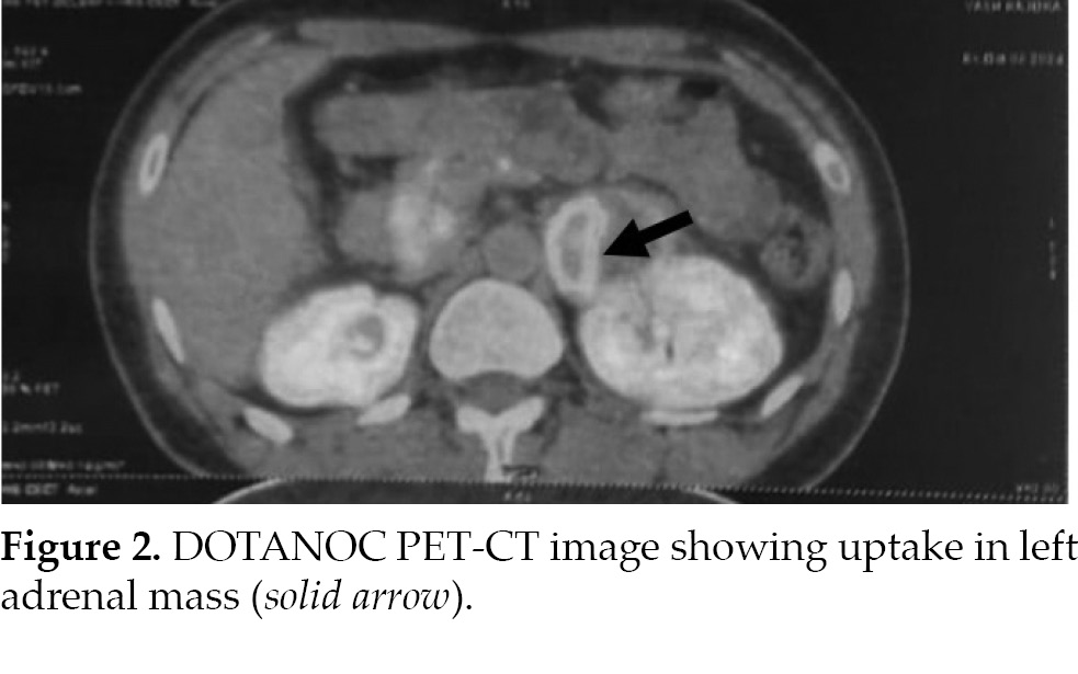 elevated at 3,910 ng/L (normal range: 7.90-88.7 ng/L). A DOTANOC-PET/CT scan indicated increased uptake in the left adrenal mass with no abnormal uptake elsewhere in the body (Fig. 2). A two-dimensional echocardiogram revealed an ejection fraction