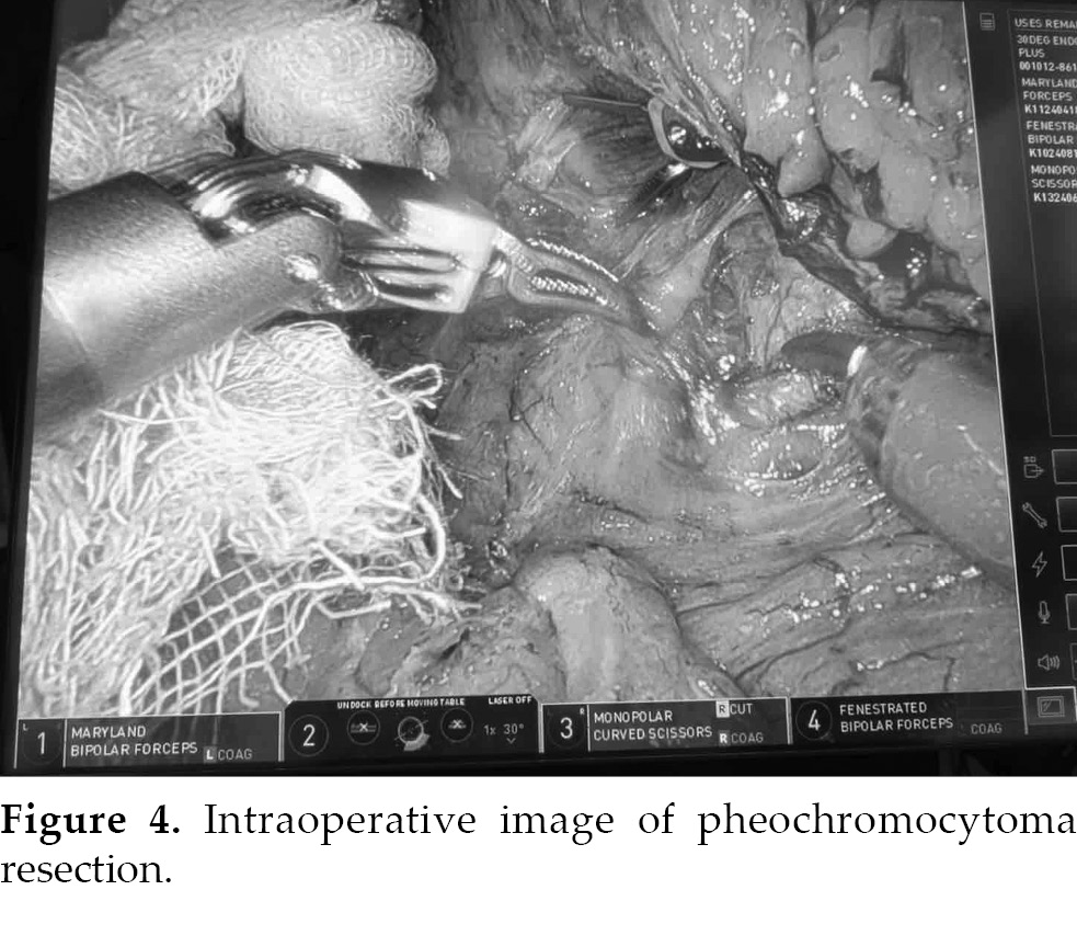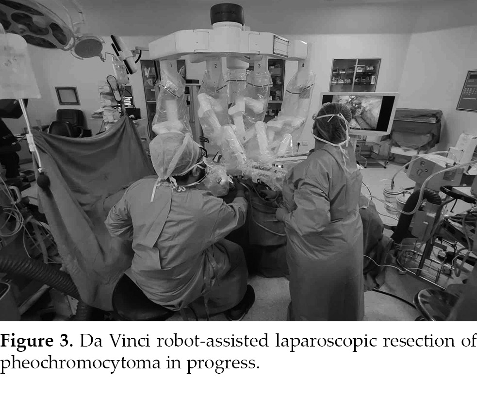 The preoperative diagnosis was established as left pheochromocytoma with DCM. The patient underwent a Da Vinci robot-assisted laparoscopic resection of the left adrenal pheochromocytoma (Fig. 3). General anesthesia induction was planned during