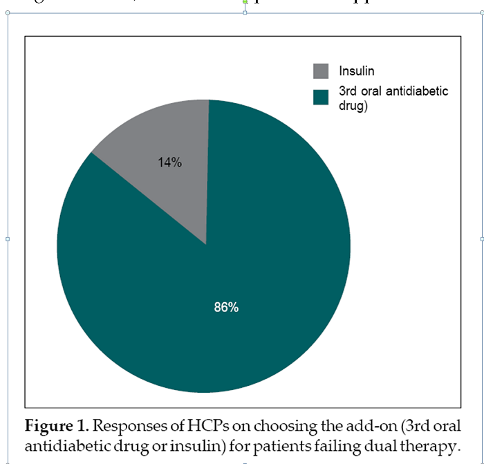 Eighty-six percent of HCPs preferred adding oral hypoglycemic agents for patients failing dual therapy, while 14% opted for insulin initiation (Fig. 1). Notably, 86% of respondents supported using a triple-drug combination as first-line therapy in newly